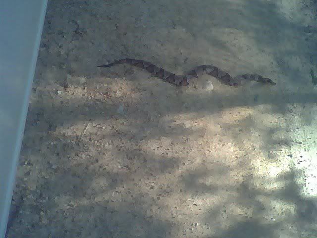 July of last year I was heading outside about 9:30 to bring a horse in to the barn for an overnight in advance of a show the next day. Our doberman preceded me down the back steps. Since it was dark and I didn't want to break my neck, I had a flashlight and shined it at the base and saw one pissed off copperhead coiled up and looking at me. The dog must have disturbed him and he was waiting for the next disturbance. That's why you don't want to be the second person on the hike.